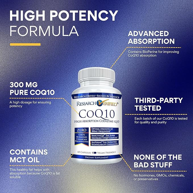 Research Verified CoQ10-100% Pure Extra Strength 300mg CoQ10 – Improved Absorption and Bioavailability with Bioperine - Boost Antioxidant Levels, Improve Cardiovascular Health, 60 Vegan Capsules