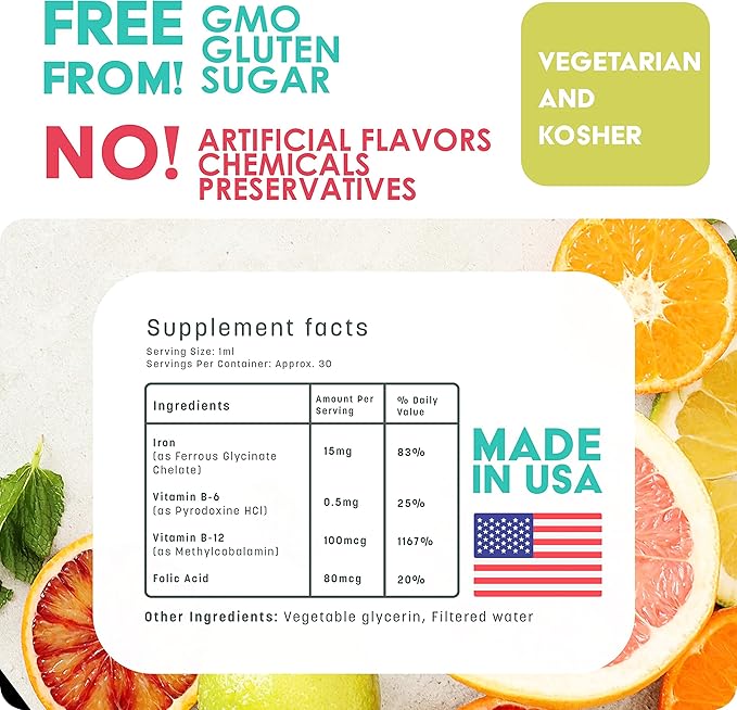 Liquid Iron Supplement for Infants Babies and Toddlers – Sugar Free Iron Drops with Folic Acid, Vitamin B6 and B12 | Certified Vegetarian | Non-GMO | Gluten Free & Tummy Gentle | Ages 4 & Under