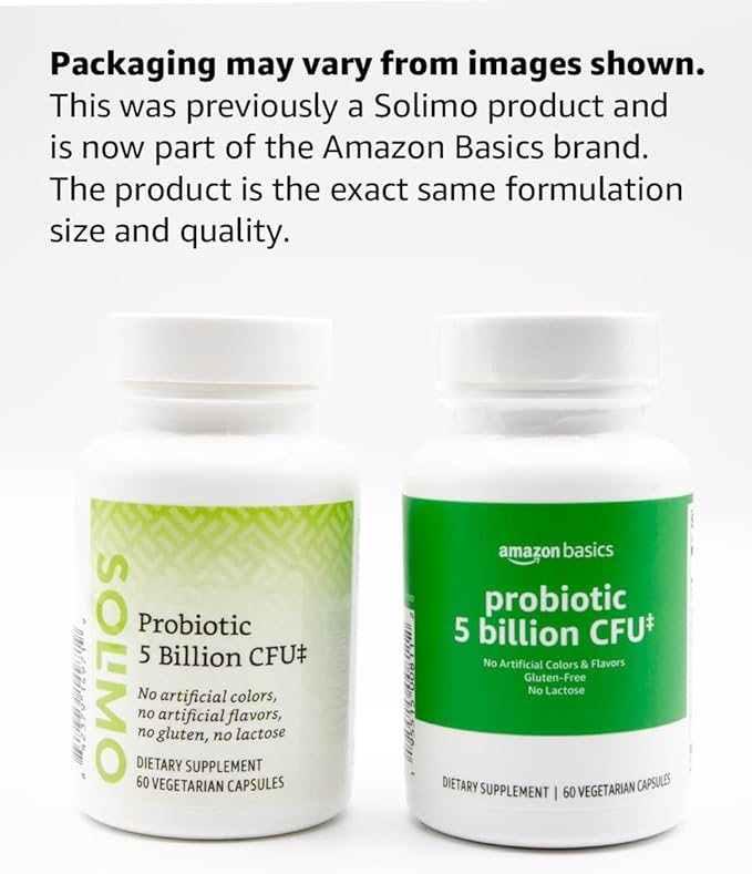 Amazon Basics - Probiotic, 5 Billion CFU, 8 Probiotic strains with 60 mg Prebiotic Blend, 60 Count Vegetarian Capsules, 2 Month Supply, Supports Healthy Digestion (Previously Solimo)