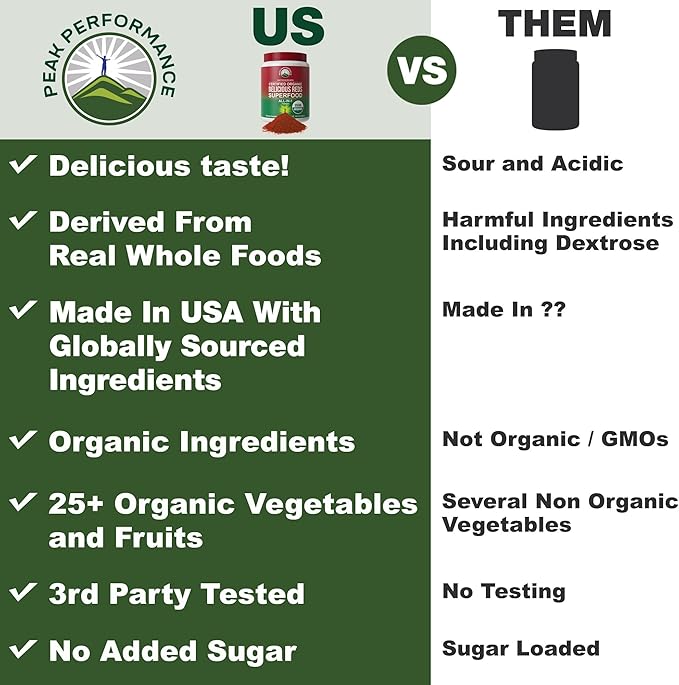 - Great Tasting Red Superfood To Alkalize And Energize – This is, hands down the most Delicious Organic Red Superfood containing over 25+ farm fresh nutrient-rich, wholesome fruits and veggies.