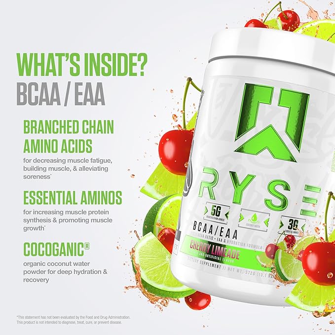 RYSE BCAA EAA Powder - Cherry Limeade - 5g Branched Chain Amino Acids, 3g Essential Aminos, Sugar-Free Electrolytes for Pre & Post Workout Muscle Recovery, Hydration and Strength - 30 Servings