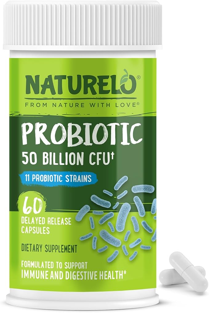 NATURELO Probiotics for Digestive Health - 50 Billion CFU, 11 Strains Daily Supplement - Boosts Immune System, Delayed Release, 60 Vegetarian Capsules