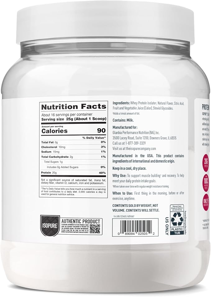 - One 14.1 oz bottle (16 servings) of Isopure 100% Pure Whey Isolate Protein Powder Infusions in dynamically delicious Mixed Berry flavor