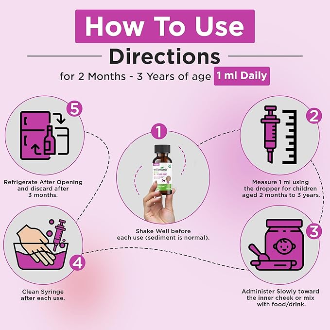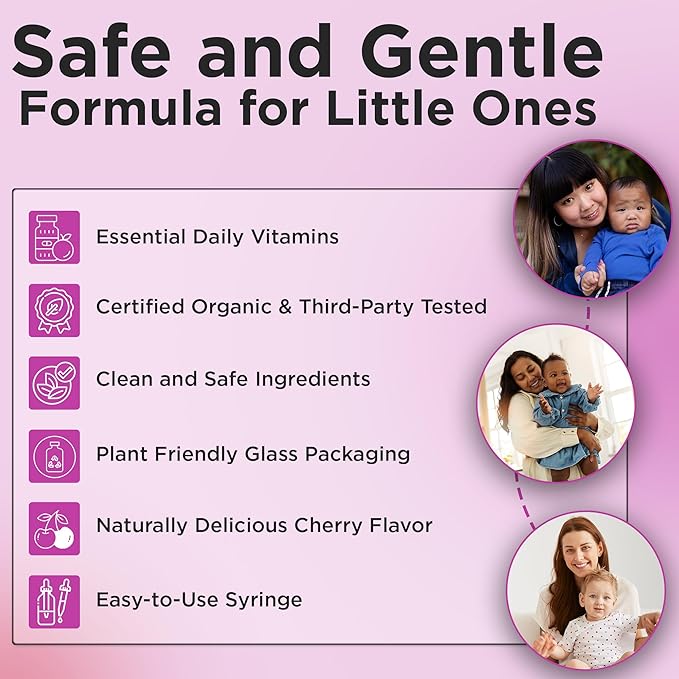 - Yummy & Convenient: Our organic multivitamins have a yummy cherry flavor that babies love! Plus they come with an easy to use syringe. Simply dispense the liquid slowly toward the inner cheek of the child's mouth.