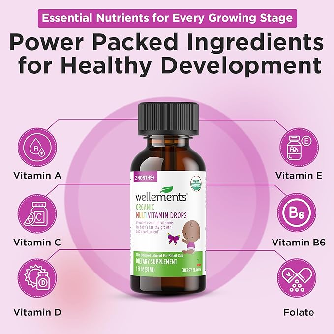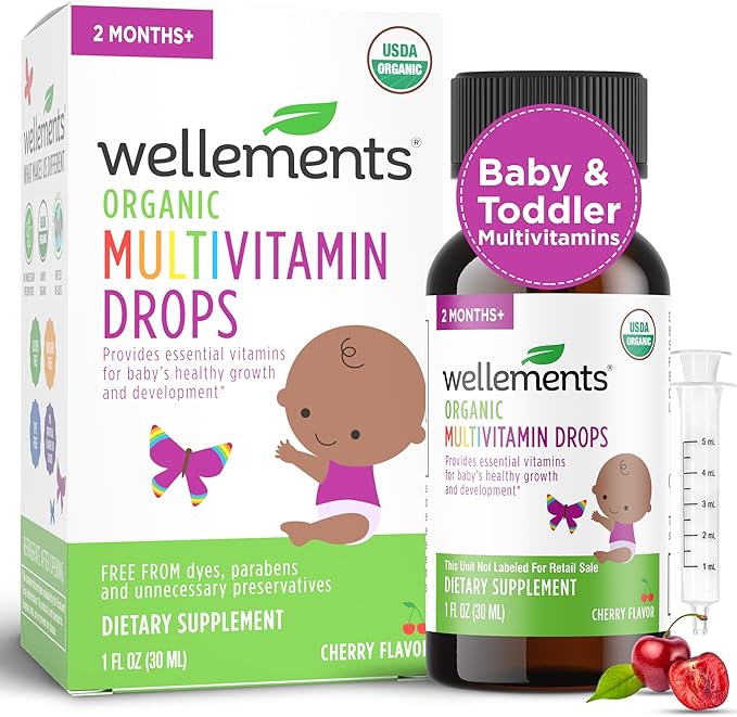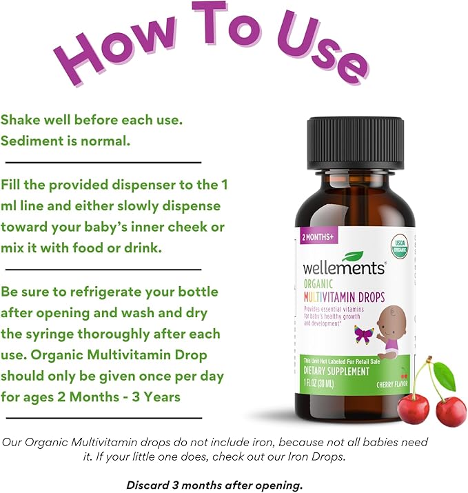 Wellements Organic Baby Multivitamin Drops (1 Fl Oz) - Cherry Flavor Liquid Multivitamins for Infants & Toddlers (2 Months+) - Toddler Vitamins for Immune Support*, Healthy Growth & Bone Development*