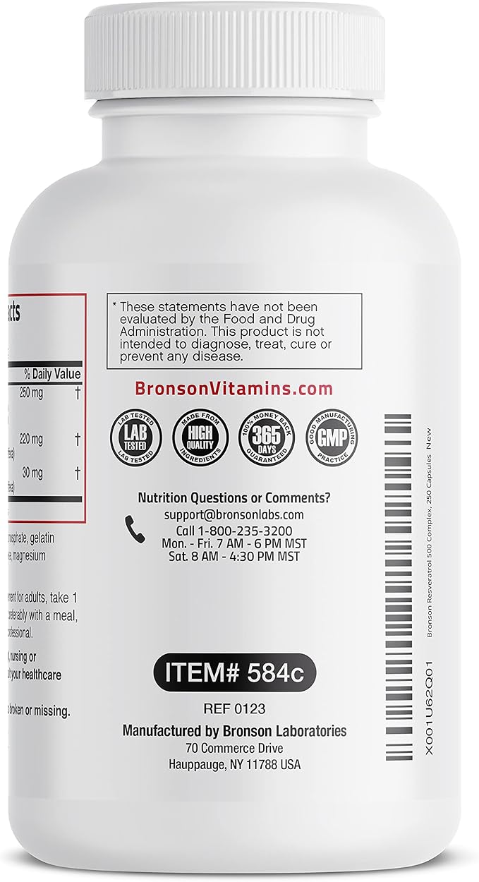 - Superior Quality Vegan/Vegetarian Formula: GMO-Free, Gluten-Free and Soy-Free. Bronson products are carefully manufactured by trained professionals in our state-of-the-art facility that is located in Hauppauge, New York. Resveratrol Complex 500 MG is Vegan/Vegetarian friendly and contains no ingredients derived from animals.