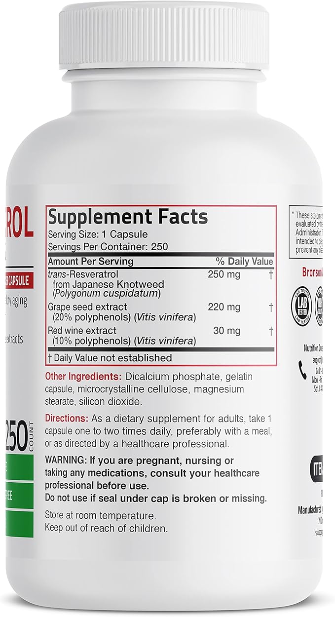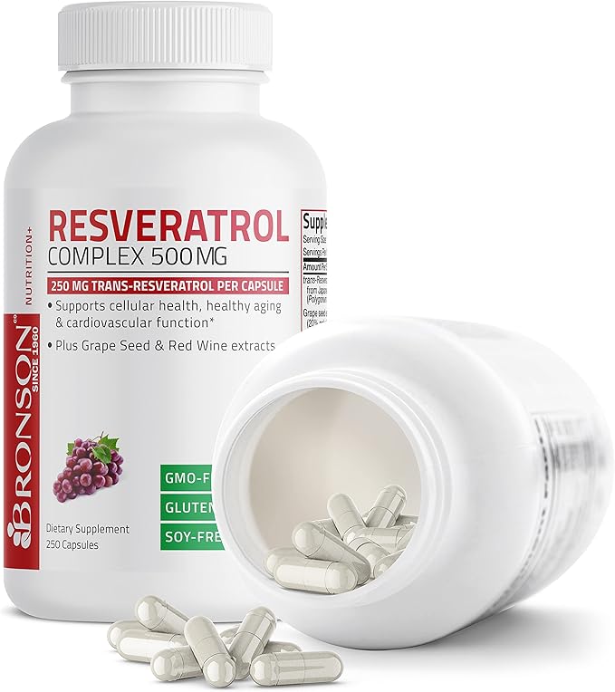 Bronson Resveratrol 500 Complex Standardized Trans-Resveratrol + Grape Seed & Red Wine Extract, 250 Capsules