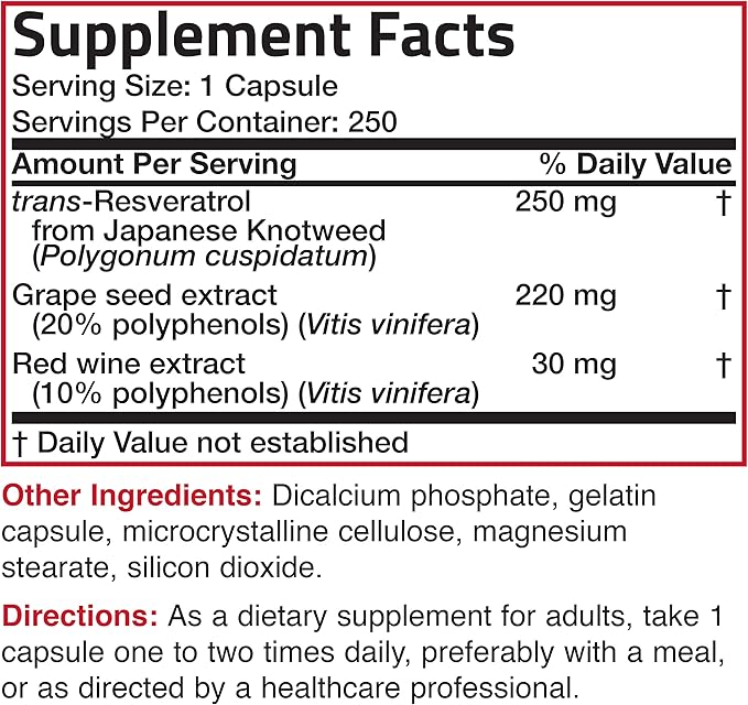 - trans-Resveratrol + Grape Seed & Red Wine: Bronson Resveratrol Complex 500 MG provides 250 mg of trans-Resveratrol that is naturally derived from the Japanese Knotweed plant. Additionally, Resveratrol Complex includes added polyphenol support through Grape Seed and Red Wine Extracts.