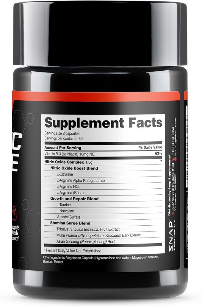 Snap Supplements Nitric Oxide Booster Supplement with L Arginine and L Citrulline Essential Amino Acids and Ginseng Root, Energy, Heart Health, Muscle Growth & Circulation Support, 60 Capsules
