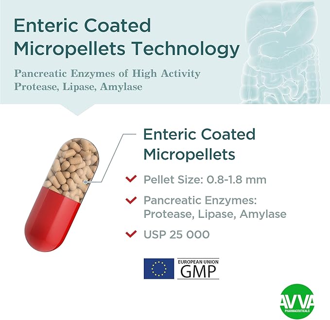 AVVA Pharmа Pancreatic Enzymes - 25,000 USP Effective Pancreatic Enzyme Supplements - Digestive Enzymes for Digestion - 50 Fast-Acting Capsules with Amylase, Lipase and Protease