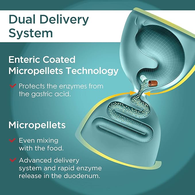 - ✅ UNIQUE: Micrazym is comprised of optimally sized (0.8–1.8mm) micropellets with an enteric coating. The enzymes are protected from from deactivation by the gastric acid, only released in the duodenum and small intestine where physiologically occur.