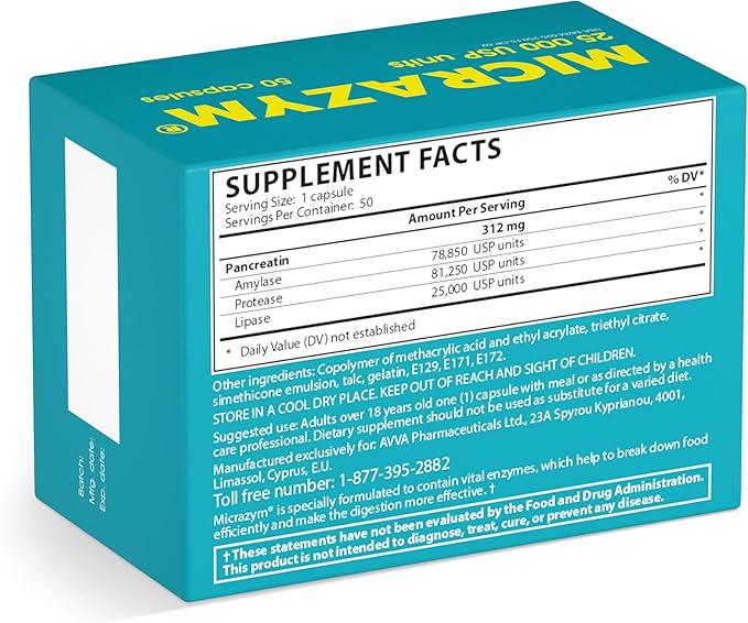 - ✅ ULTRA high-strength formula: 25,000 USP units of Micrazym digestive enzyme supplements containing lipase, protease, and amylase to help break down fats / lipids, proteins, and carbohydrates.