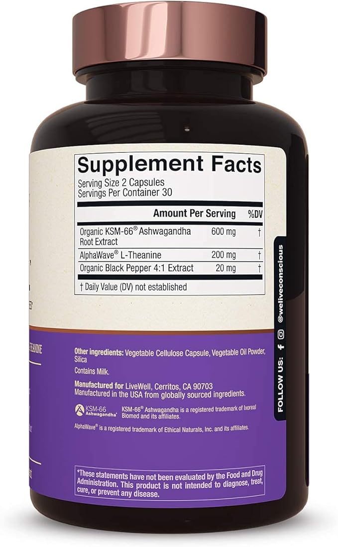 Live Conscious KSM-66 Ashwagandha Supplement w/L Theanine & AlphaWave - ZenWell Everyday Stress Relief, Cognitive, Brain Health - Ashwagandha for Men & Women - 60 Capsules