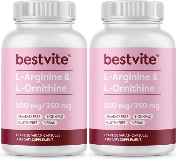 BESTVITE L-Arginine L-Ornithine 500-250 (240 Vegetarian Capsules) (120 x 2) - No Stearates - No Fillers - Vegan - Non GMO - Gluten Free - No Calcium Silicate
