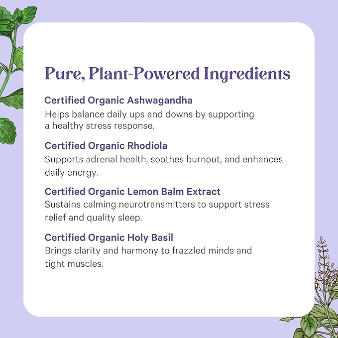 - ORGANIC STRESS RELIEF: Each bottle (60 capsules) provides an all-star roster of nature’s top adaptogens that support stress relief, including organic extracts of ashwagandha, rhodiola, lemon balm, and holy basil.