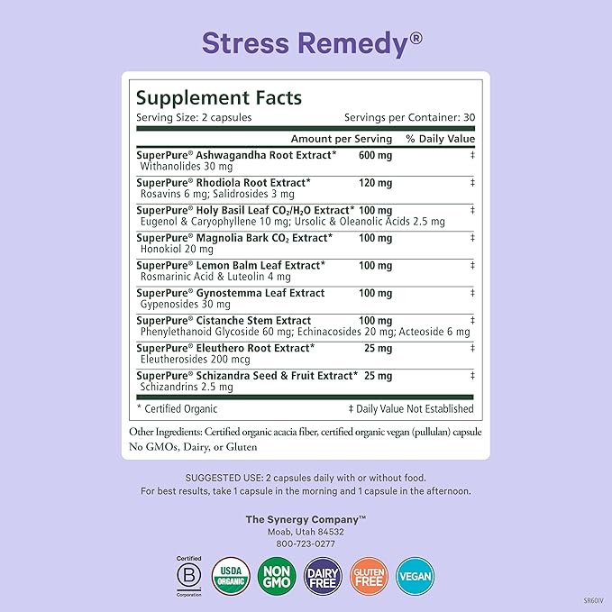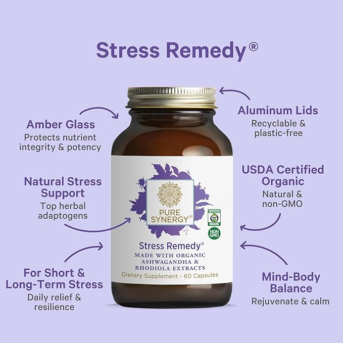 PURE SYNERGY Stress Remedy | Soothing Supplement with Ashwagandha | Organic Adaptogen Support from Rhodiola, Lemon Balm, and Holy Basil | for Stress Relief, Adrenal Health, and Mood (60 Capsules)