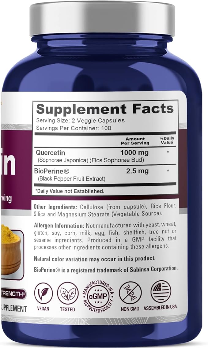 - High Absorption Quercetin 1,000mg per serving with Bioperine Serving is 2 capsules