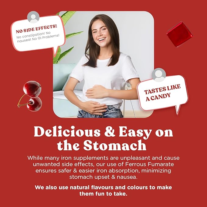 - Juicy Cherry Flavor - Bursting with sweet cherry goodness, our individually wrapped iron chewables are your ticket to on-the-go wellness. The fusion iron supplement leaves taste buds dancing with delight, without a metallic aftertaste or indigestion