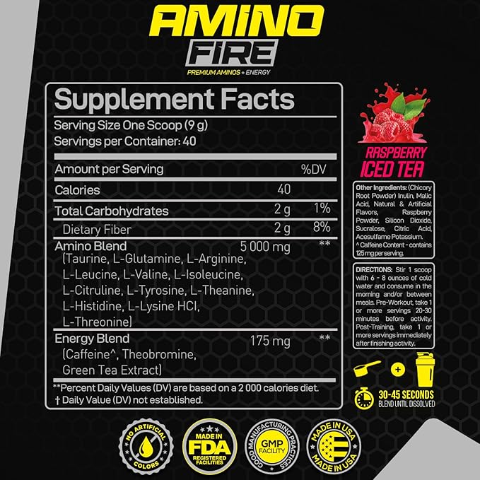 - 🏃 ENHANCED ENERGY FORMULA: Power through your workouts with Amino Fire, featuring a powerful blend of 5000mg of amino acids and 175mg of an energizing blend per 9g serving. Crafted with natural caffeine, it delivers sustained energy and stamina, ideal for boosting your pre-workout performance.