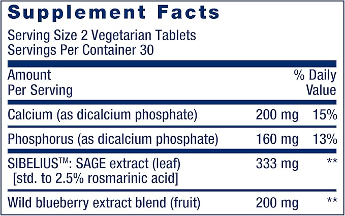- Primary Supplement Type : Calcium (as dicalcium phosphate), Phosphorus (as dicalcium phosphate), Proprietary Wildcrafted Blueberry Blend, SIBELIUS™: SAGE extract (leaf) [std. to 2.5% rosmarinic acid] Calcium (as dicalcium phosphate), Phosphorus (as dicalcium phosphate), Proprietary Wildcrafted Blueberry Blend, SIBELIUS™: SAGE extract (leaf) [std. to 2.5% rosmarinic acid]
