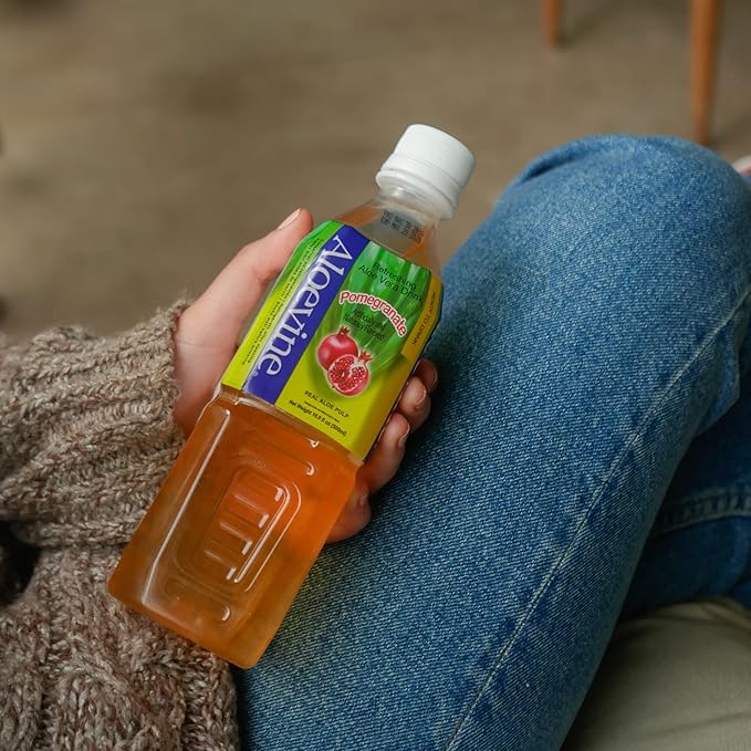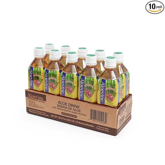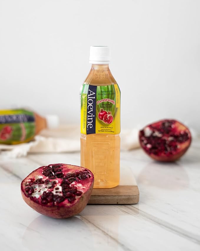 - ALOE VERA JUICE POMEGRANATE: Aloevine Pomegranate Drink contain 8% aloe pulp, combined with the delicious flavor of pomegranate, this beverages makes it your best choice.