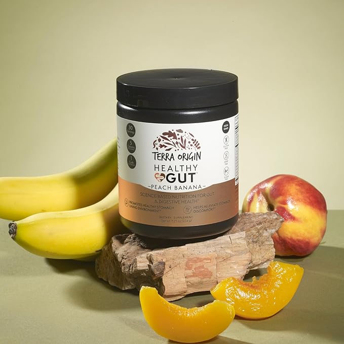 TERRA ORIGIN Healthy Gut Peach Banana | 30-Servings with L-Glutamine, Zinc, Glucosamine, Slippery Elm Bark, Marshmallow Root and More!