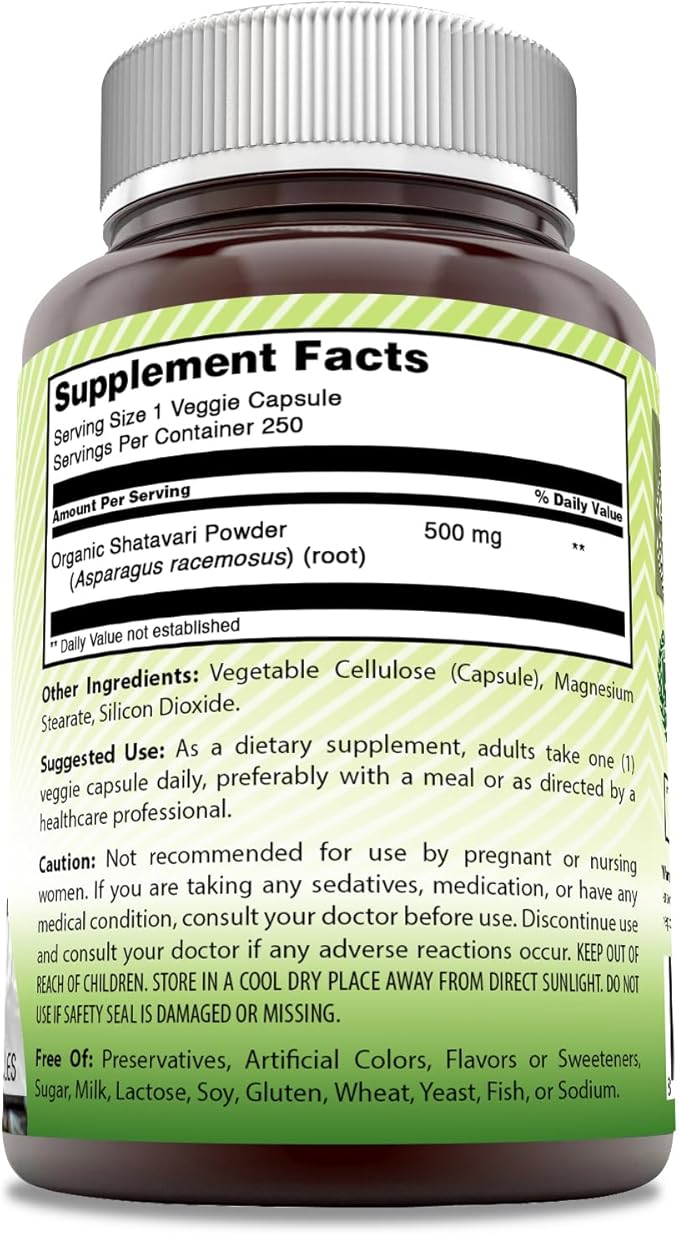 Amazing India Natural Shatavari 500 Mg per Serving 250 Veggie Capsules Supplement | Non-GMO | Gluten-Free