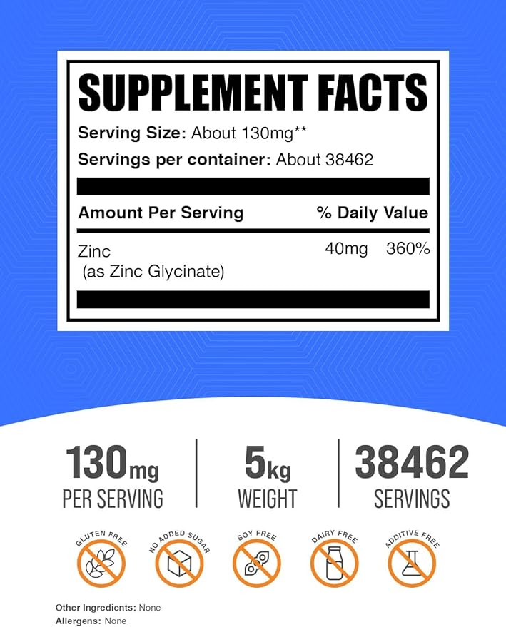 BulkSupplements.com Zinc Glycinate Powder - Zinc Supplement, Mineral Supplement for Immune Support - Gluten Free, 130mg per Serving, 5kg (11 lbs) (Pack of 5)