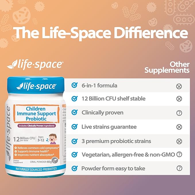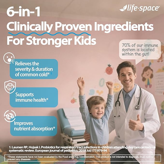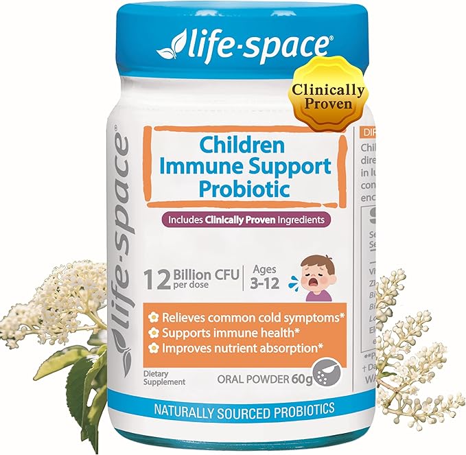 Life-Space Children Immune Support Probiotic, Clinically Proven to Relieve Common Cold Symptoms, 12 Billion CFU, 6 In1 Kids Probiotic for Digestive & Immune Health, 2 Month Serving, 60 Grams