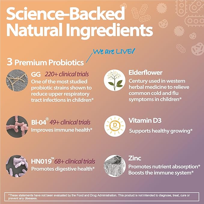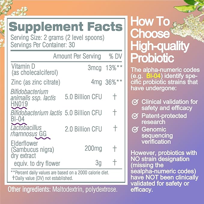 - RESEARCH-BACKED INGREDIENTS WITH PURPOSE - Features Features Lactobacillus rhamnosus GG (studied in 250+ trials for immune support*), Bifidobacterium Bl-04 (associated with respiratory wellness*), and HN019 (linked to digestive balance). Enhanced with Vitamin D3 (supports healthy development), Zinc (contributes to immune function), and Elderflower (traditionally used in Western herbalism) – powerful support for your daily probiotic routine.