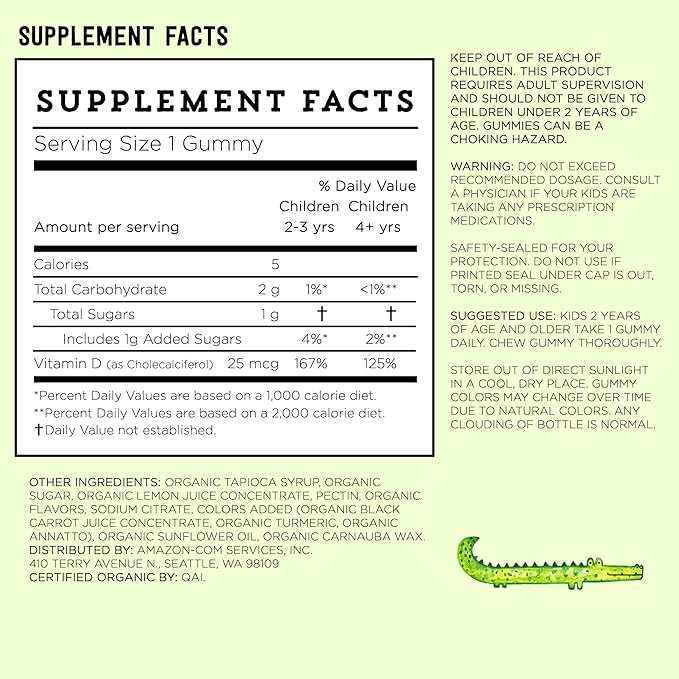 Amazon Brand - Mama Bear Organic Kids Vitamin D3 25 mcg (1000 IU) Gummies per serving, Bone and Immune Health, Strawberry, 80 Count