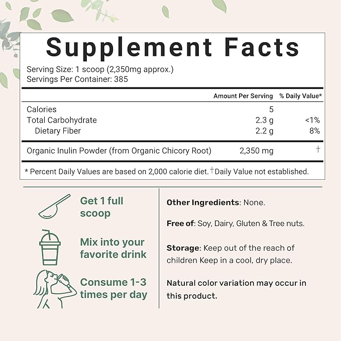 - Every pouch provides up to a 385 day supply, 1 scoop serving size contains approximately 2,350mg pure vegan friendly inulin.