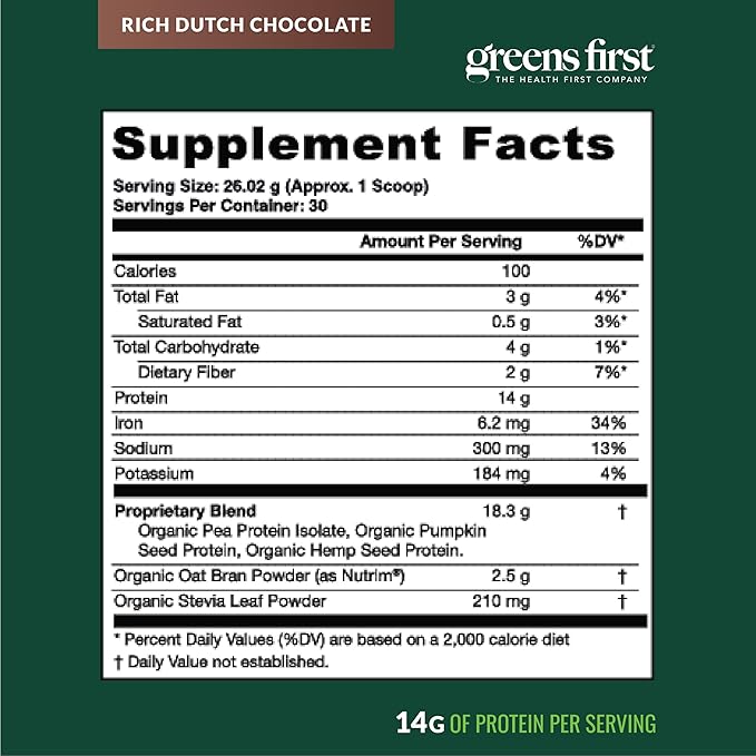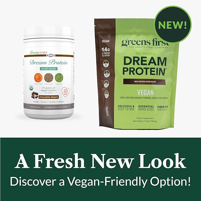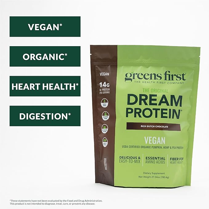 Greens First Dream Protein Plant-Based Vegan Powder - USDA Organic Pumpkin, Hemp & Pea Protein - Gluten-Free, Non-GMO, No Added Sugar (Rich Dutch Chocolate, 27.54 oz)