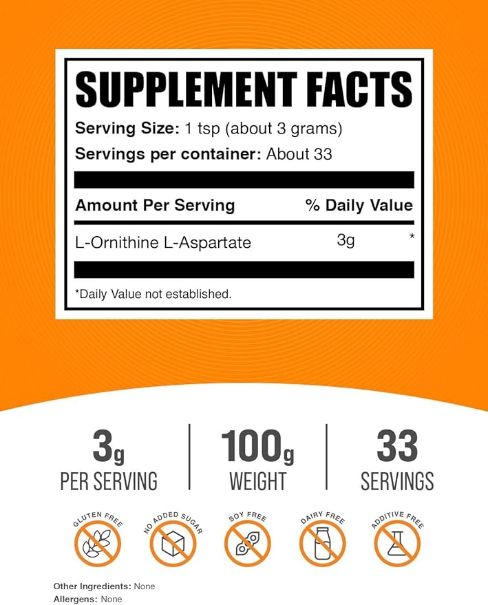 BulkSupplements.com L-Ornithine L-Aspartate Powder - Ornithine Supplement, Amino Acid Supplement - Gluten Free, 3g per Serving, 100g (3.5 oz) (Pack of 1)