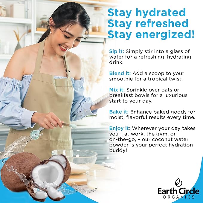 - ✅ RECOMMENDED SERVING & USAGE: Mix 1.5 Tbsp of Pure Coconut Water Powder into 8oz of water for a refreshing and hydrating drink. This unsweetened, electrolyte-rich powder dissolves instantly with no clumps, delivering 1 gallon of pure hydration per pack. Safe to swallow and easy to digest, it's perfect for smoothies, baked goods, or on-the-go hydration—whether you're at the gym, outdoors, or staying energized at work. Just add water and enjoy!
