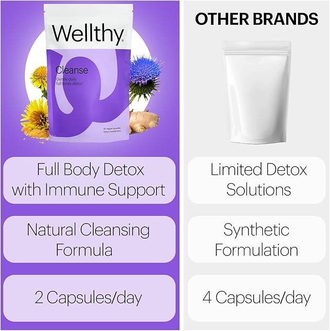 Wellthy Full Body Detox and Immune Support - Advanced Digestive Health, Gut Cleanse and Bloating Relief - All Natural Formula with Milk Thistle, Dandelion Extract and L-Carnitine | 30-Day Supply