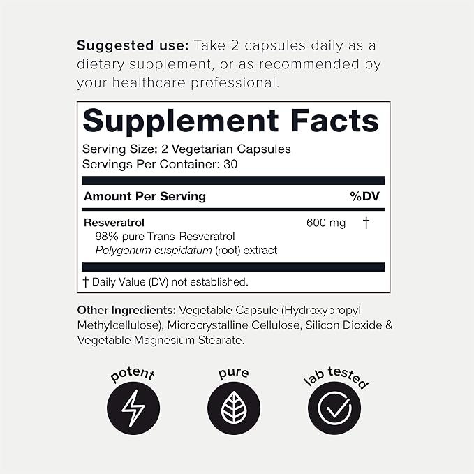 - Product Benefits : Resveratrol Supplement - 98% Pure Trans Resveratrol 600mg;3rd Party Tested