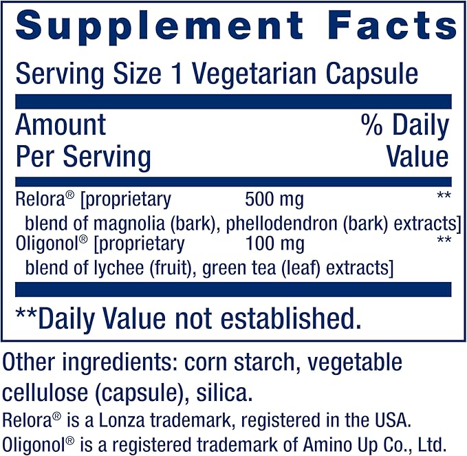 - Supports overall mood – Active ingredients in this formula’s proprietary Relora blend have been shown to support mood and stress, improving mood scores measured by standardized testing.