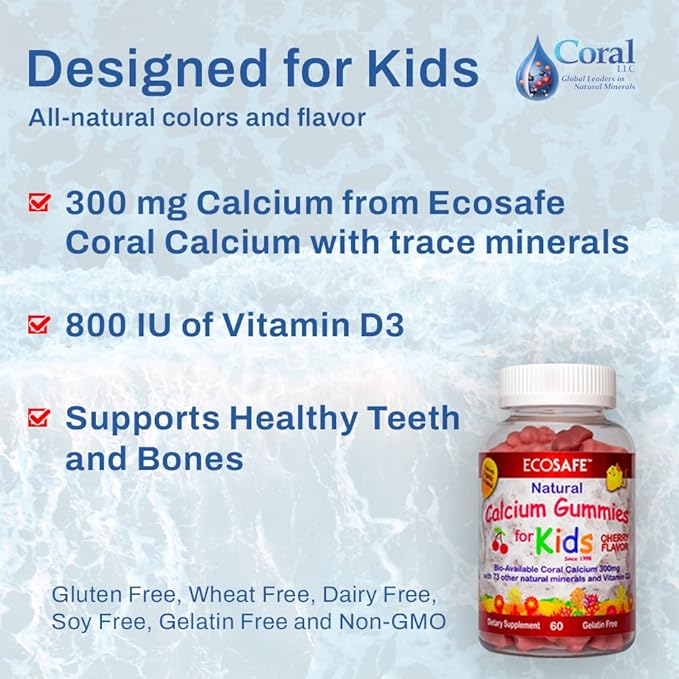 - Coral Natural Coral Calcium Vitamin D3 Gummies for kids offers 300 mg of bioavailable calcium derived from EcoSafe, above-sea coral and 500 IU of Vitamin D3 (125 percent of recommended daily value), which together help support healthy bone development, teeth and metabolic function.