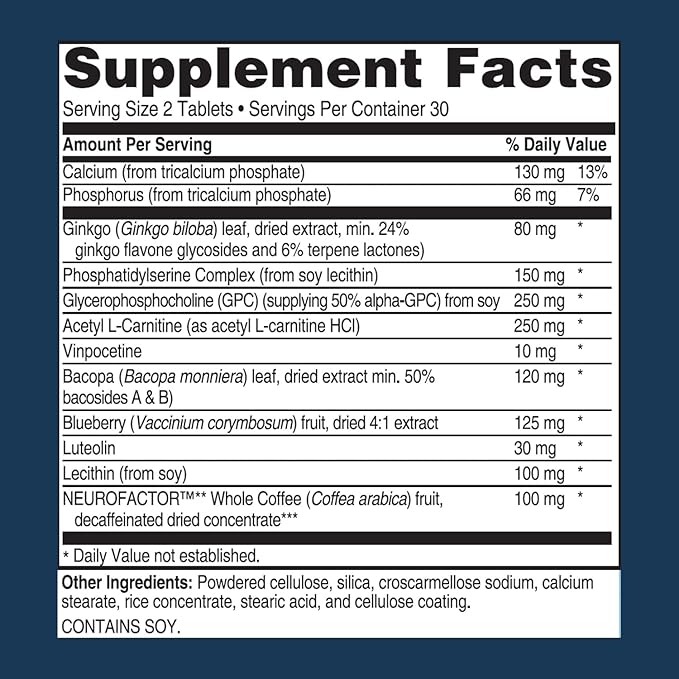 - ADVANCED MEMORY FORMULA: Advanced Memory Formula gives you nine powerful, well-researched nutrients shown to support mental performance and protect your brain health as you age. These ingredients include bacopa, phosphatidylserine, luteolin, and blueberry. This formula is also Non GMO, Gluten Free, Vegan, and Soy Free.