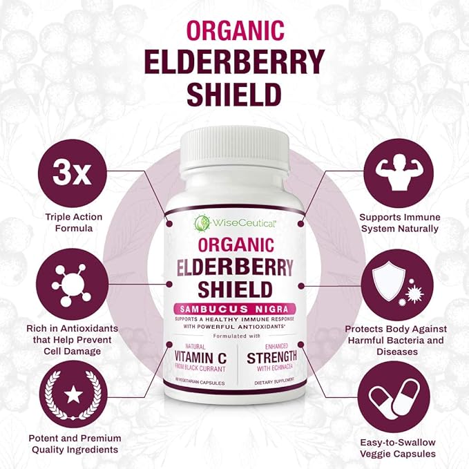 Max Strength USDA Organic Black Elderberry, Black Currant Extract & Echinacea | 3 in 1 Natural Immune Support & Vitamin C | Sugar-Free, Vegan-Friendly | Homeopathic Remedy | 60 Count