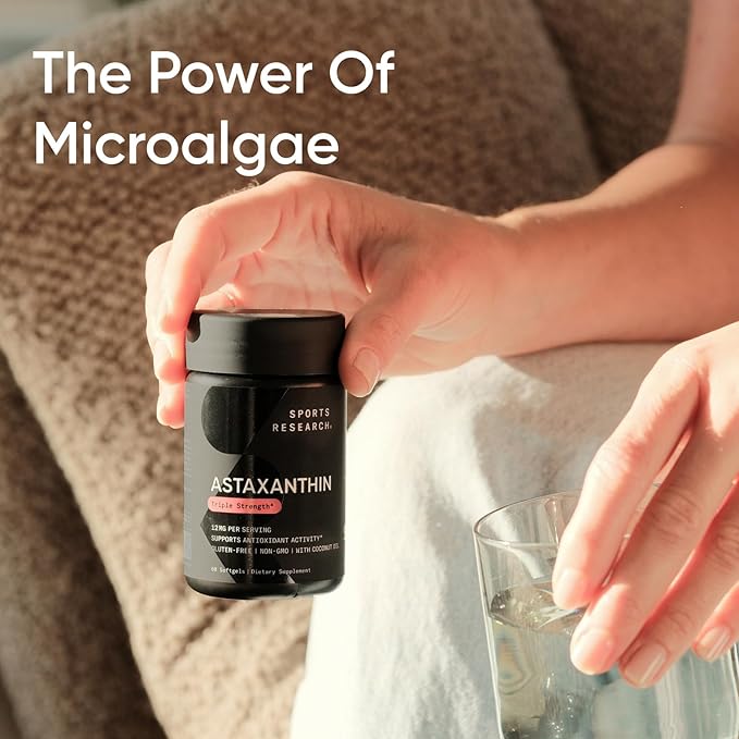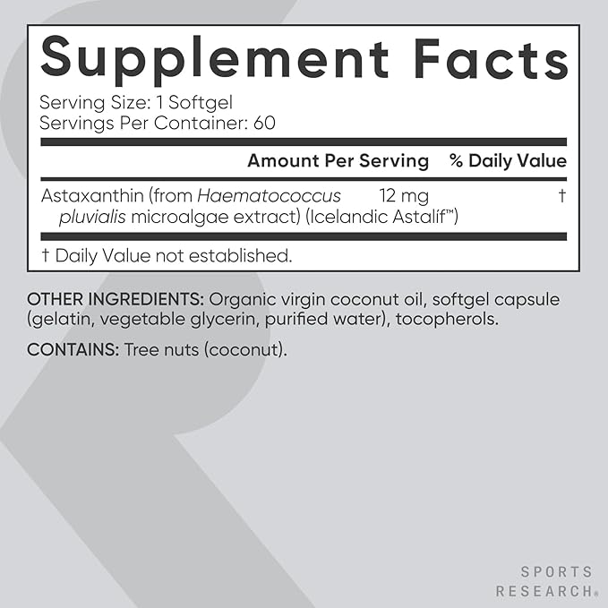Sports Research Triple Strength Astaxanthin 12mg with Organic Coconut Oil - Antioxidant Supplement, Non-GMO Verified & Gluten Free - 60 Softgels