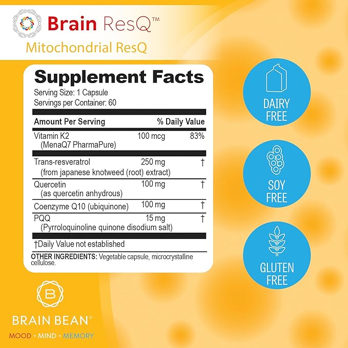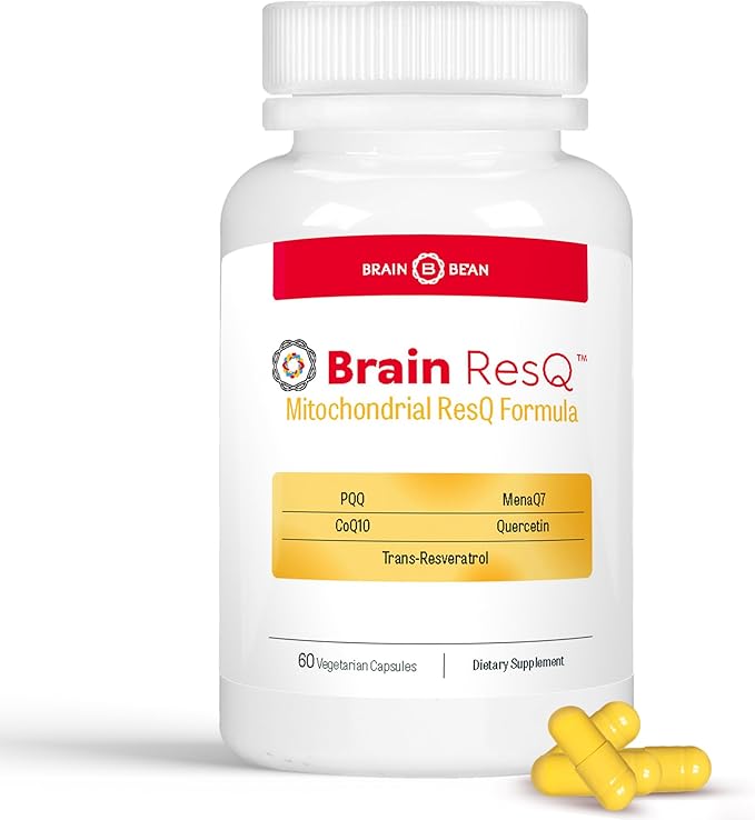 Brain ResQ Advanced Mitochondrial Formula with PQQ, CoQ10, Trans Resveratrol, MenaQ7 & Quercetin Supplement - 100mg of CoQ10 & 15mg PQQ โ Supports Brain, Heart & Cellular Health โ 60 Capsules