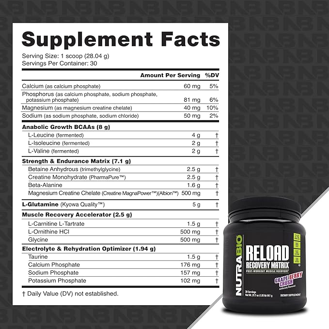 NutraBio Reload - Powerful Muscular Recovery Formula - Post-Workout Supplement - 3G Creatine - 8G BCAAs - 5G Glutamine - 30 Servings, Grape Berry Crush