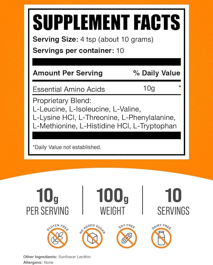- Maximize your Potential: Enhance your active lifestyle with our Essential Amino Acids powder, or EAA powder, designed to support your strength and performance goals. Each serving delivers a substantial 10 grams dose, catering to both fitness enthusiasts looking to push their limits.
