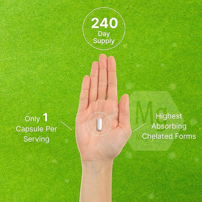 - Serving Size – Every bottle has up to an 8-month supply and contains 240 veg capsules. Only takes one per serving to receive a 500mg proprietary blend of magnesium glycinate, malate, gluconate, taurate, lactate, citrate, aspartate, ascorbate, oxide, and carbonate