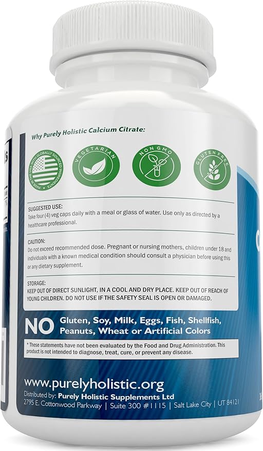 - ✓ A BRAND YOU CAN TRUST - Purely Holistic’s Calcium Citrate 1000 mg for men or women has been formulated and manufactured at our own facility in the USA. All our supplements and vitamins are lab-verified for potency and purity. We are all about your satisfaction. If you don’t feel an improvement, we will handle it, no questions asked.