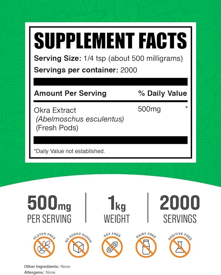 BulkSupplements.com Okra Extract Powder - Okra Supplement, Source of Fiber, Herbal Supplement - Vegan & Gluten Free, 500mg per Serving, 1kg (2.2 lbs) (Pack of 1)