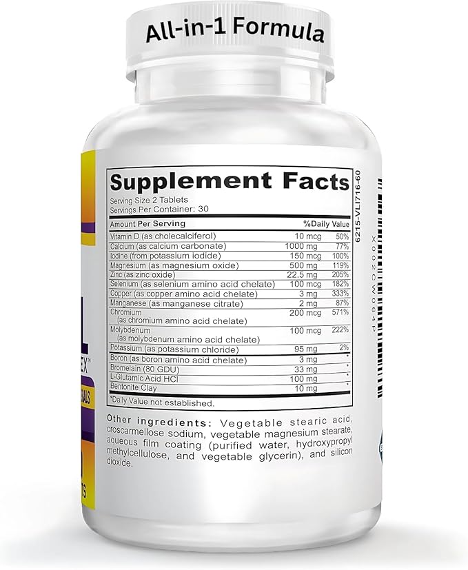 - PROFESSIONALLY FORMULATED WITH: Vitamin D, Calcium, Iodine, Magnesium, Zinc, Selenium, Copper, Manganese, Chromium, Molybdenum, Potassium, Boron, Bromelain, L-Glutamic Acid HCl, and Bentonite Clay (known for containing most trace minerals) | All-in-1 Multi Minerals Supplement for Men & Women