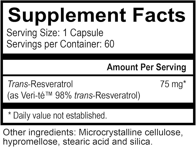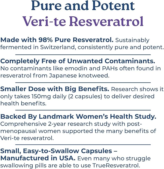 - SMALLER DOSE WORKS JUST AS WELL – Just 75mg of the pure Veri-te resveratrol taken twice daily, has been shown to be optimal dose to take, and can work as well as higher amounts of less pure resveratrol in supporting bone, brain, skin and womens health